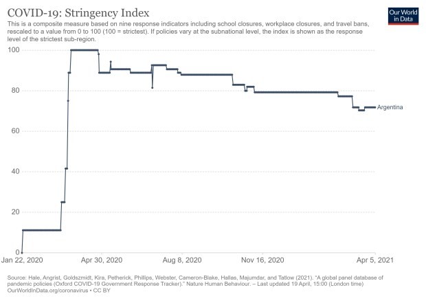 A partir del mes de agosto comenzó a descender hasta ubicarse en un nivel de 70. Es decir, nunca se terminó del todo con la cuarentena pero sí fue muy estricta entre marzo y julio y a partir de agosto comienza a flexibilizarse.