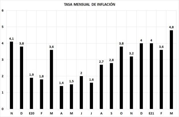 Recordando que la cuarentena comenzó hacia fines de marzo de 2020, la parte más estricta fue en esos últimos 10 días de marzo y se extendió hasta principios de agosto. Justamente en la parte más estricta la tasa de inflación se mantuvo en el orden del 1,5% mensual. A partir de agosto cuando comienza a suavizarse algo la cuarentena, la tasa de inflación se duplica pasando del 1,5% mensual al 3% mensual promedio aproximadamente, y luego se dispara a un escalón del 4%, acelerándose en marzo de este año al 4,8% mensual.