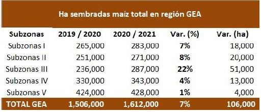 El NE bonaerense (subzona III) se destaca por el mayor incremento de superficie maicera con un aumento de área del 22%. Le sigue el centro y sur santafesino (Subzona I y II) con una suba del 7 y 8%. De esta manera, la región sembró su mayor hectareaje histórico de maíz con 1,6 M ha. Descontando aquellas destinadas a consumo animal, el área de maíz comercial (cosecha de grano) asciende a 1,5 M ha.