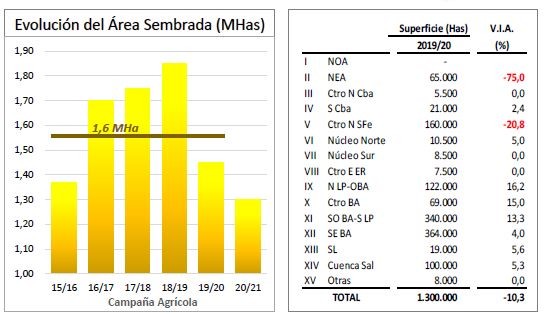La producción total nacional se ubica en 2.7 MTn reflejando una caída de un 10% interanual y ranqueando como la mas baja en siete años (Campaña 2013/14: 2.3 MTn
