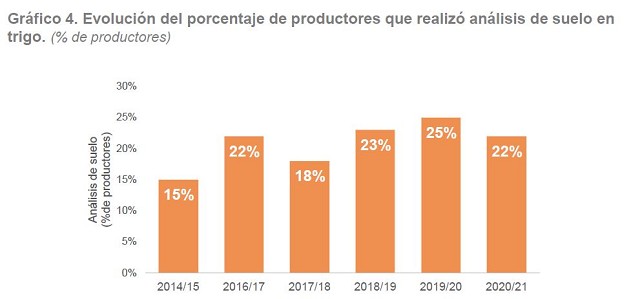 En la campaña 2020/21 el 22% de los productores realizó análisis de suelo en trigo, 3 p.p. menos en comparación con la campaña anterior. La evolución del mismo puede verse en el gráfico 4. Este indicador refiere al porcentaje de productores que realizó análisis de suelo a fin de diagnosticar la disponibilidad de nutrientes, el contenido de materia orgánica, agua, entre otros. El análisis de suelo es una práctica fundamental debido a que permite realizar una evaluación general de la capacidad productiva del suelo.