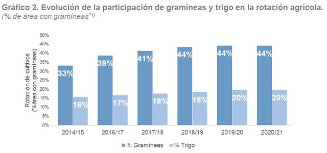 La participación de gramíneas en la rotación creció del 33% al 44% entre las campañas 2014/15 y 2018/19, y desde entonces se mantiene. Tal crecimiento se explica, en parte, porque el trigo aumentó su contribución del 16% al 20%*2. El resto lo completó el cultivo de maíz y, en menor medida, cebada y sorgo.