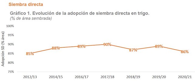 En la campaña 2020/21 el 86% del área se realizó bajo siembra directa, 3 p.p. por debajo de la campaña anterior. La evolución de la adopción de siembra directa de trigo a nivel país se representa en el gráfico 1. Por otro lado, el mapa 1 muestra la adopción de siembra directa a escala regional para la campaña 2020/21. La misma estuvo en un rango de 59% a 99%, y esta variación está relacionada a distintas causas regionales.