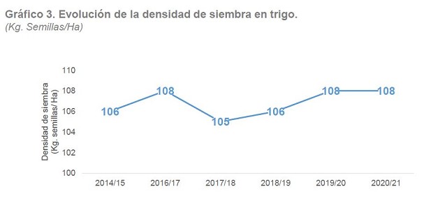 En la campaña 2020/21 se sembraron 6,5 M Ha de trigo en Argentina. Se sostuvo el área en relación a la campaña 2019/20 y se obtuvo un rinde promedio de 28,2 qq/Ha, mostrando una caída interanual del rendimiento del 3,6 %. Del mismo modo que el área sembrada, la adopción de tecnología se mantuvo similar a la campaña previa, con mejoras en algunos de los indicadores.