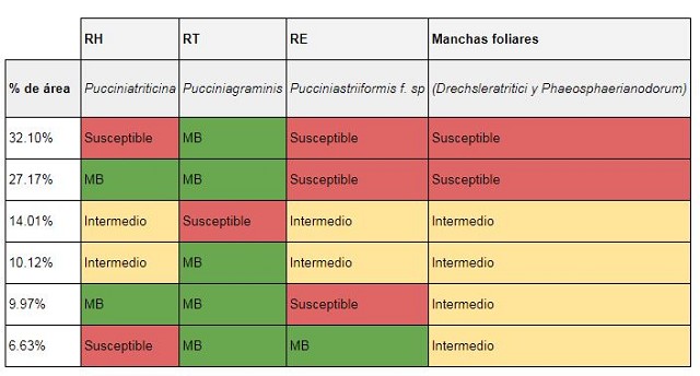 Según la información de la base de datos, y proporción de siembra, dentro de SIMA, puede verse que, salvo para la roya del tallo, en las demás los materiales sembrados tuvieron un comportamiento dispar, según la caracterización de variedades de INTA.