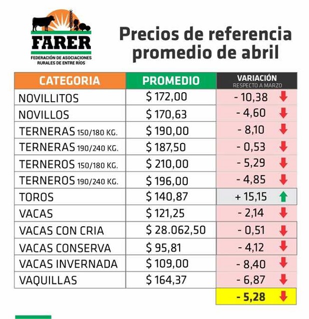 La Federación de Asociaciones Rurales de Entre Ríos (FARER) continuó con la elaboración del informe mensual de precios de referencia del ganado vacuno. Los porcentuales se calculan en base a los precios obtenidos de las firmas consignatarias que operan en la provincia.
