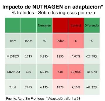 Para el M.V. Elbio Bresan, Gerente técnico de ganadería de Phibro, lo destacable de esta experiencia es que se superaron los parámetros de un establecimiento que ya estaba en los límites de la mejora sanitaria, incluso con metafilaxis. “Si bien el ensayo se hizo en un feedlot comercial o sea sin las precisiones que arrojaría un estudio académico, los datos obtenidos marcan una tendencia contundente. Con Nutragen, disminuyeron las pérdidas y esto coincidió con un mayor consumo, porque los animales más sanos son más productivos ante situaciones de estrés, como la adaptación, el transporte e incluso el calor”, concluyó.