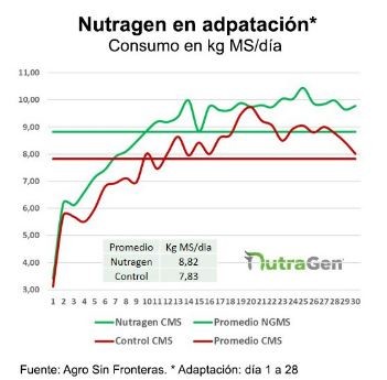 ¿Qué pasó con el consumo? “Tal como esperábamos, los animales que recibieron el suplemento, los de la línea verde (en el gráfico), en promedio, consumieron 8,8 kg de MS/ día, un 12, 6% más que el grupo control”, indicó, aludiendo que atravesaron mejor un período crítico como es la adaptación.
