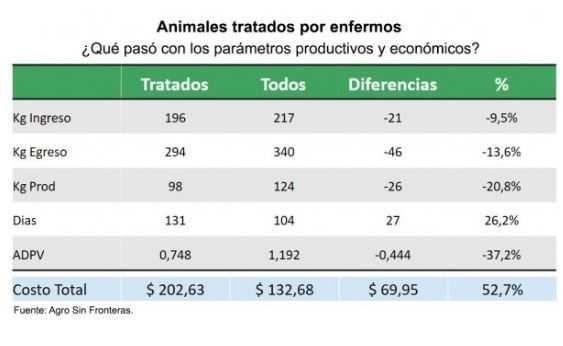 En tal sentido, en los últimos dos años se trató el 5,8% del stock y sus parámetros productivos fueron muy distintos a los del conjunto de la población. “En promedio ganaron 450 gramos menos por día (0,748 gr/día vs 1,192 gr/día), produjeron 26 kilos menos por cabeza (98 kg vs 124 kg) y estuvieron 27 días más a corral para salir gordos”, reveló.