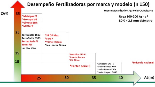 Figura 2: Desempeño de marcas de fertilizadoras por CV y ancho de labor *fuente “Mecanización Agrícola FCA Balcarce”, 2020.