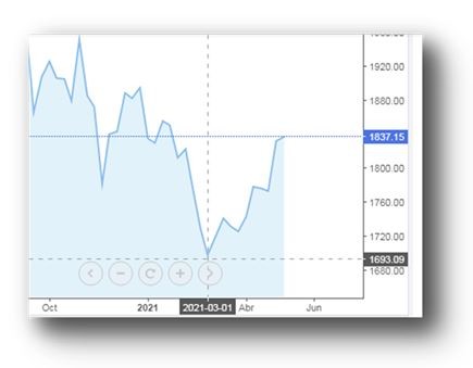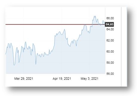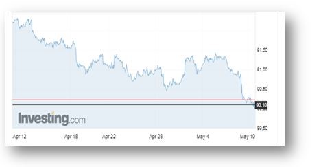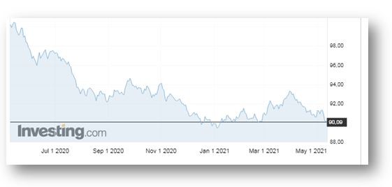 Este índice se redujo desde 103,96 puntos en marzo de 2020 a un mínimo de 89,165 a principios de 2021. Tras una recuperación hasta el nivel de 93,47 a finales de marzo, comenzó de nuevo una tendencia a la baja en abril. Y hoy está por debajo del nivel de 91.