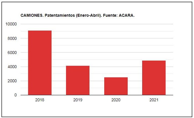 Según las estadísticas de ACARA, las 4.881 unidades patentadas entre enero y abril de 2021 reportan una caída de -46,5% respecto a los 9.124 camiones registrados en el primer cuatrimestre de 2018, antes de desplome de los indicadores macroeconómicos.