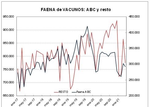 Durante el último mes, la faena fue un 10% menor a la de doce meses atrás y un 5% al promedio entre 2005 y 2010. En los últimos doce meses, se han sacrificado algo menos de 14 millones de cabezas, 1% por menos a la media registrada entre 2002 y 2020, los altos guarismos de la segunda mitad del año pasado están compensado la tendencia descendente que se advierte desde que se inició 2021.