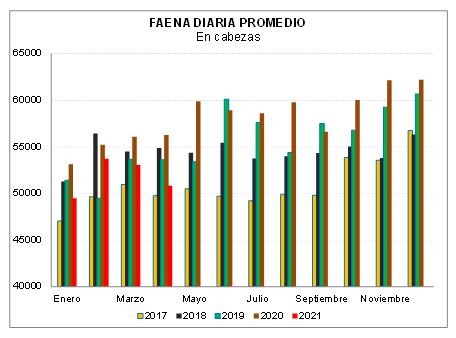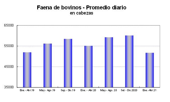 De acuerdo a datos proporcionados por la Dirección Nacional de Control Comercial Agropecuario (DNCCA), en abril de 2021 la faena de bovinos alcanzó 1.07 millones de cabezas, 100 mil cabezas por debajo del período anterior y 10% menor a la de doce meses atrás. Entre enero y abril del corriente año, se han sacrificado 4.2 millones de bovinos, 6% menos que en igual lapso de 2020 y un nivel similar al registrado en 2019.