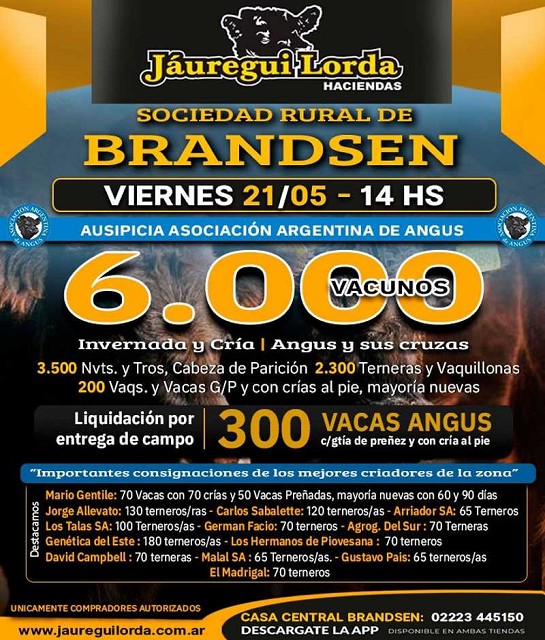 La Asociación Argentina de Angus auspicia el remate especial de invernada y cría que se realizará el viernes 21 de mayo a las 14 horas en Brandsen, donde saldrán a subasta alrededor de 6 mil vacunos.