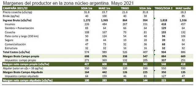 Este año se cosecha igual, pero nunca vimos al cultivo entregarse y perderse de esta forma”, dicen. Y los maíces, a pesar de la falta de agua están promediando 105 a 110 qq/ha en esa zona. Hay otro dato que llama la atención en los análisis que se hacen allí de postcampaña: “los maíces hechos tras el trigo funcionaron mejor que la soja: están dando 55 qq/ha contra 10 o 5 o nada de soja de segunda”, explican. Esta es la otra cara que inclina la balanza a favor de sumar hectáreas con maíz en el ciclo 2021/22, aparte de los buenos márgenes: el maíz es clave para escapar a este doble envolvimiento que plantea la falta de agua en la región núcleo.