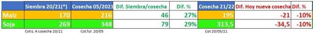 Si bien y las bajas en las cotizaciones se pausaron, y comenzaron muy tibiamente a recomponerse en el mercado local. La tabla actualizada comparando cosecha 21, respecto a siembra y con la nueva campaña hoy muestra lo siguiente:
