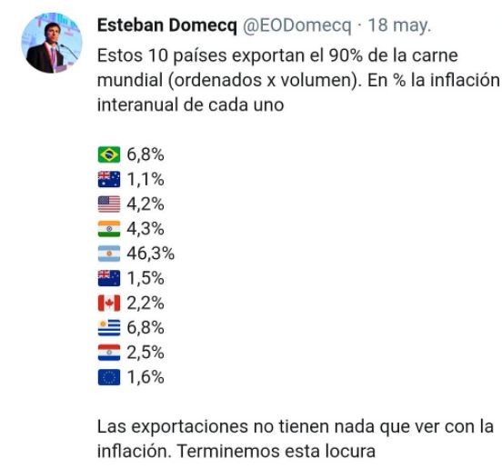 Te comparto este twit de Esteban Domecq, donde nos muestra los 10 países que concentran el 90% de las exportaciones de carnes del mundo y sus índices de inflación.