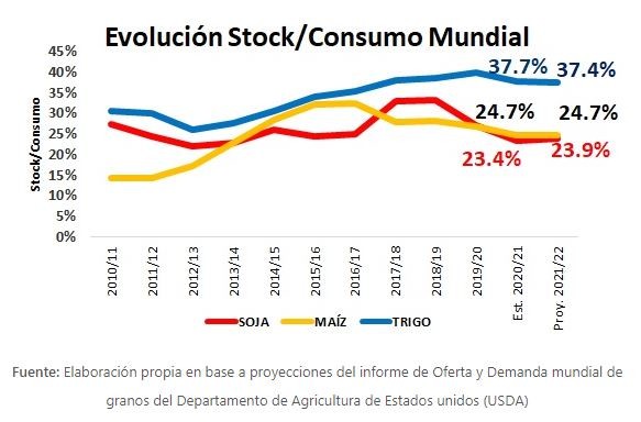 Las proyecciones de producción mundial de soja 21/22, según el USDA, suman más de 22 millones de toneladas a la cosecha 20/21, mientras el consumo mundial sumaría más de 11 millones de toneladas. A simple vista, la producción suma el doble respecto al consumo, y esto debiera elevar los stocks finales globales significativamente, pero no es así, recordemos que la 20/21, con una producción mundial de 363 millones de toneladas y un consumo de 368 millones, tuvo un recorte de stock final mundial de 10 millones de toneladas, respecto al año anterior, que este año se recuperaría apenas sumando 4 millones de toneladas.