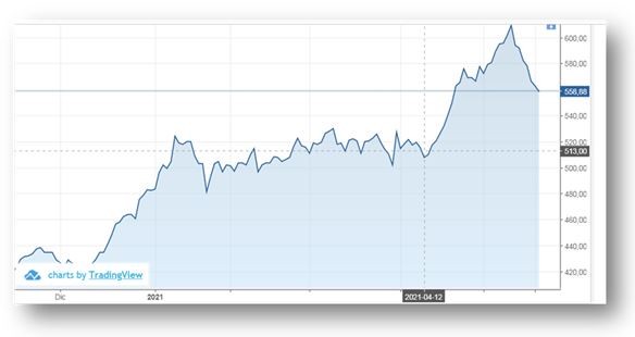 Precio de la soja, en USD por tonelada, desde diciembre-20 a la fecha. FOB (Chicago)