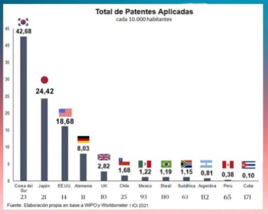 Según datos de la World Intellectual Property Organization y Worldometer, Argentina pose un registro de 0,81 patentes aplicadas cada 10.000 habitantes. A esta situación se le suma el reciente descenso de seis posiciones (112) en el índice de Calidad Institucional 2021 (1).