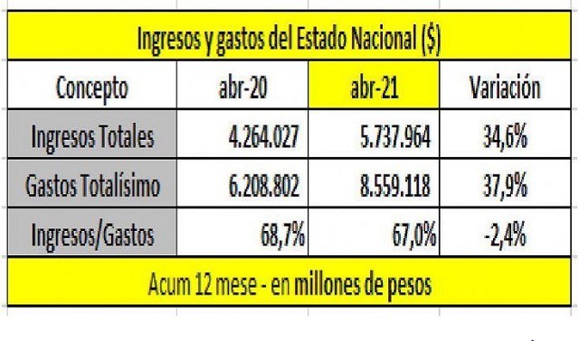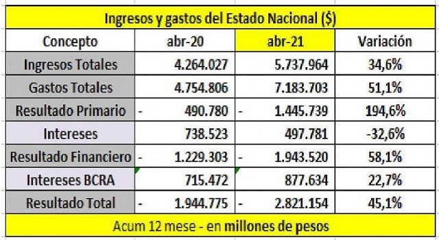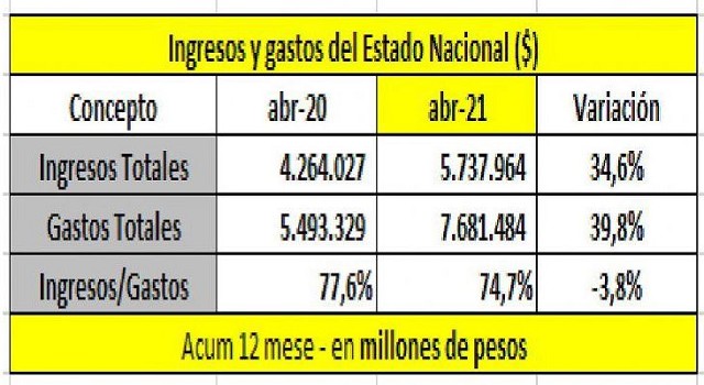 En los últimos 12 meses el resultado fiscal primario (ingresos menor egresos) fue de $1.445.739 millones. Podría ser menor porque con el Impuesto a la Riqueza se recaudaron $233.000 millones y aún no fue incorporado como ingreso en las cuentas públicas. Los ingresos primarios financian el 80% de los gastos totales.