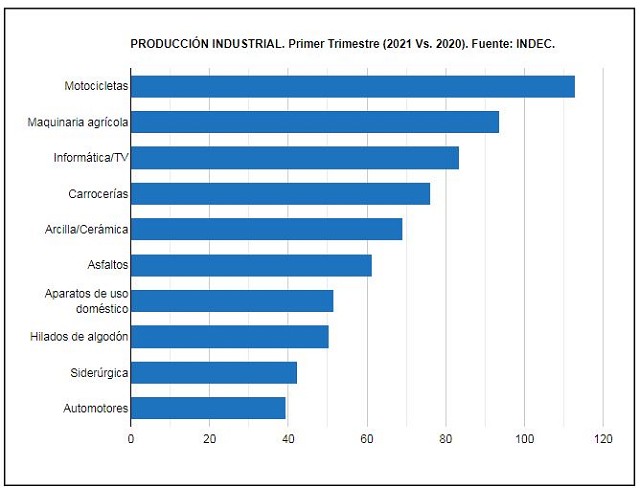 Durante el primer trimestre del año, el sector reportó un incremento de 93,7% respecto a igual período de 2020, según el Índice de Producción Industrial (IPI) que publica mensualmente el INDEC.