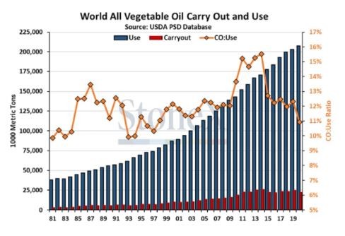 El Covid-19 trajo consigo un cambio en varios paradigmas globales y uno de ellos tiene un gran impacto en el negocio de los commodities agrícolas: políticas medioambientales que impulsan un mayor uso de biocombustibles en USA, la UE e Indonesia. Esto se dio en medio de un año muy particular que fue el 2020, donde problemas productivos en varias regiones del mundo, dejaron el abastecimiento global de aceites con la relación stock / consumo, según el USDA, más ajustada desde 1998 (ver gráfico).