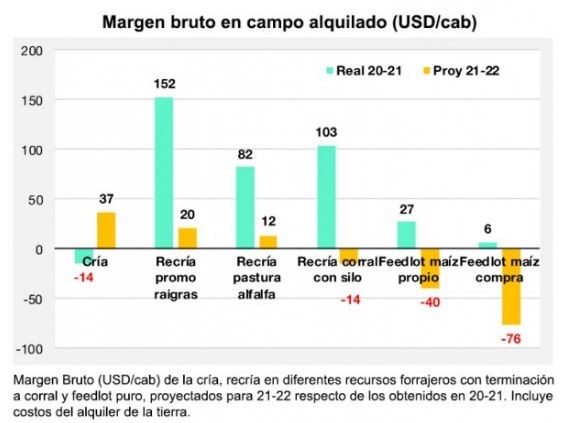 La cría en campo propio mejorará nuevamente sus resultados en 2021/22 (llegando 217 USD/cab) debido a la suba del ternero, combinada con costos directos (forrajes y personal) que se incrementaron en menor magnitud. A su vez, esta actividad, a diferencia de años anteriores, podrá pagar el costo de renta de la tierra y generar un resultado positivo (USD 37/cab) en campo alquilado.