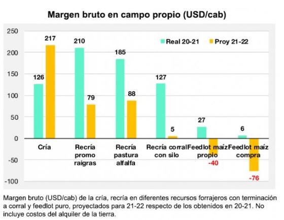Los mayores aumentos registrados en el precio de la hacienda de invernada respecto de la destinada a faena y una suba moderada (pasto) a alta (grano y silaje) en los costos de alimentación, afectan a todos los planteos ganaderos de recría y/o terminación. Cuanto más intensivo es el planteo ganadero, mayor es el impacto negativo sobre el margen bruto. En contraposición, el margen de la cría subirá un nuevo escalón en 2021/2022 respecto del ciclo anterior, lo cual podría impulsar la tan ansiada mejora de los indicadores de eficiencia con beneficios para toda la ganadería.