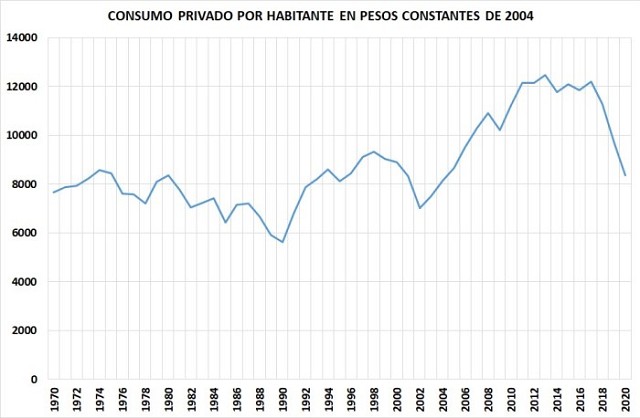 Nuevamente, en pesos constantes de 2004, en 2020 el sector privado tuvo un consumo por habitante que fue el 1,1% menor al de 1975, con el Rodrigazo siempre como referencia. Obviamente que el momento más crítico de los últimos 50 años lo encontramos en la hiperinflación.