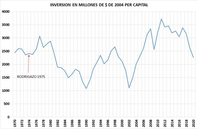 Solo hay dos años en los que la inversión per cápita fue menor a la de 2020. En 1989/90 con las llamaradas hiperinflacionarias y en la crisis del 2002.