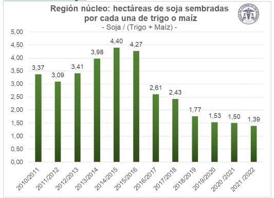 En la región núcleo, para la campaña 2021/22 se espera un incremento anual de 137 mil ha de maíz (+8%), 50 mil ha de trigo (+2,5%) y una caída de soja de 100 mil ha (-2%). Pero, ¿por qué el aumento de gramíneas es tan importante para hacer a la producción más sustentable? Hace algunos años, cuando dominaba la soja en el paisaje de la región, la falta de rotación incentivaba la aparición de malezas resistentes, pérdida de fertilidad de los suelos y de biodiversidad. El quiebre de esta tendencia fue en la campaña 2016/17. A partir de allí, los incentivos comerciales acompañaron la adopción de lo que es la práctica más eficiente a mediano plazo para el control de malezas, plagas y cuidado del suelo: la rotación de cultivos.