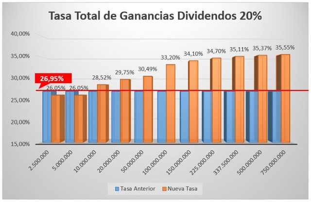 Al 20%. Se pasa una tasa fija del 26,95% a una progresiva que va de 26,05% a 35,55%. El resultado es que solo una pequeña pyme que obtenga resultados por menos de 5 millones de pesos tiene una tasa menor, si distribuye 1 de cada 5 pesos ganados.