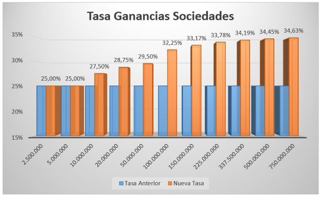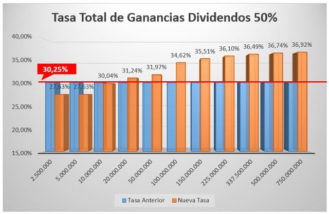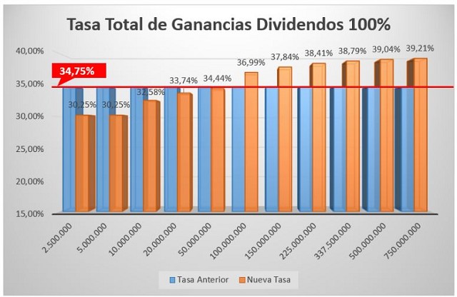 Al 100%. Con la ley anterior, se tenía una tasa fija del 34,75%; con la ley nueva, una tasa progresiva que va de 30,25% hasta un 39,21% en nuestro caso con el tope de ingresos elegido (750 millones de pesos). En la práctica, en aquellas compañías que distribuyen la totalidad de sus resultados, solo las que ganan menos de 50 millones de pesos tienen una escala total inferior a partir de la normativa aprobada la semana pasada.