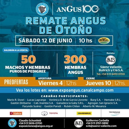 La firma martillera Sáenz Valiente, Bullrich y Cía. S.A. será la encargada de la venta de 44 machos y 6 hembras de pedigree, y 300 Hembras Seleccionadas (muchas de las cuales llegarán al remate como Madres Angus Seleccionadas).