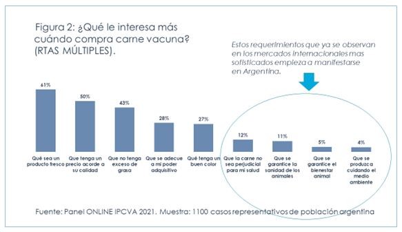 En un primer orden de prioridades aparece la frescura. Siempre se vincula esta característica con la calidad e inocuidad de la carne. En el tope de los intereses y preocupaciones de la gente se contemplan seguidamente la relación precio/calidad y dentro de la calidad específicamente se tienen en cuenta las características organolépticas visuales como el color de la carne o la cantidad de grasa que presenta. “En el acto de compra, la carne entra por el bolsillo y por los ojos”. En su segundo orden de interés aparecen aspectos más vinculados a las implicancias del producto en la salud y aquellos vinculados al proceso de producción como ser la sanidad y trato que se les da a los animales (bienestar animal) y los cuidados al medioambiente (Figura 2).