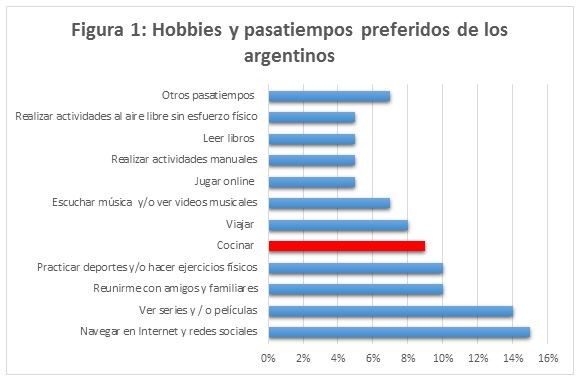 Mirar series y películas, navegar en internet y por las redes sociales, practicar actividad física, reunirse con amigos y cocinar aparecen entre los hobbies y pasatiempos preferidos en el país del tango, el fútbol y el asado. Los resultados de una encuesta online realizada por el Instituto de Promoción de la Carne Vacuna Argentina (IPCVA) con una base muestral de 1100 casos representativos de todo el país demuestran cómo los argentinos usan su tiempo libre. (Figura 1)