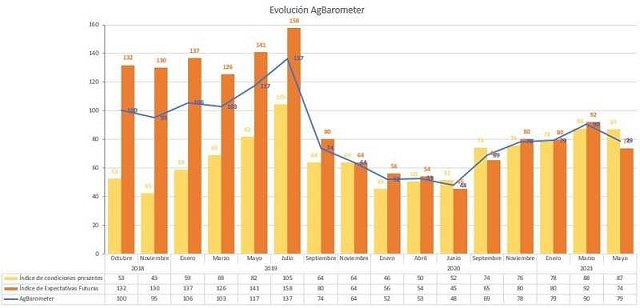 "Su caída es muy alta ya que representa un 19 % desde la última medición (92 en marzo vs. 74 en mayo). A su vez, es mucho más marcada que la del Índice de Condiciones Presentes que es del 1% (87 en marzo vs. 88 en mayo). Esto impacta decisivamente en el Índice Ag Barometer Austral el cual mostró una caída del 12%", detallan.