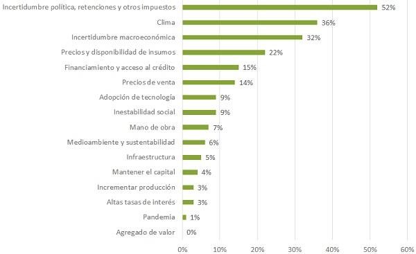 Cuando se consulta a los productores sobre las tres principales preocupaciones que tienen de aquí a un año, la incertidumbre política, las retenciones y el aumento de impuestos, sumado a la incertidumbre macroeconómica, dan como resultado un 82 % de las menciones.