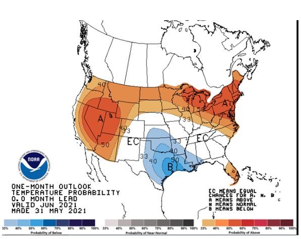 El mapa que sigue muestra el pronóstico de temperaturas para junio, donde el norte más próximo a los grandes lagos se advierte la estimación de temperaturas por encima de lo normal.