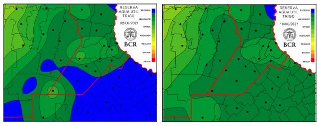 Sin lluvias, ésta semana hubo actividad febril de sembradoras: se sembraron 492 mil ha. Ya se lleva sembrado el 60% del trigo intencionado en la región, o sea 1 M ha. La siembra pasó a igualar el avance del año pasado y se adelanta a las otras 5 anteriores campañas en un 15%. El año pasado el gran problema era que la falta de agua se imponía: casi 200 mil ha quedaron sin poder sembrarse. Este año, en cambio la siembra arrancó con todo el potencial agroclimático. Hay algunos problemas de falta de agua en algunas zonas, pero con pocos milímetros podrían resolverse: las reservas actuales de humedad no muestran áreas reservas regulares todavía. Por otro lado la humedad sigue ingresando a la región y habrá que ver si logran transformarse en precipitaciones. En general, hay un buen escenario de siembra, por lo que esta vez sí se espera concretar la intención de 1,7 M ha de trigo.