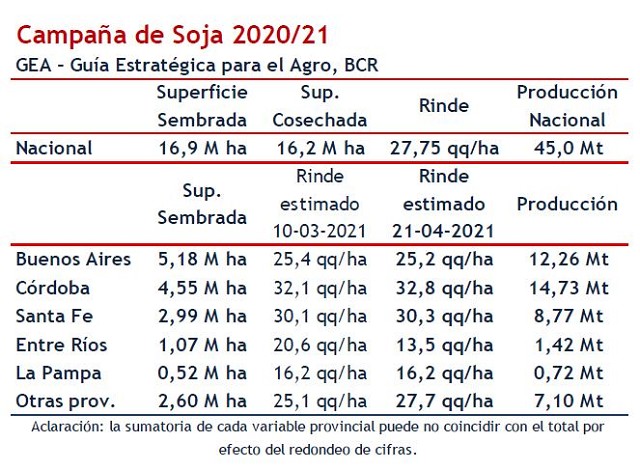 Sólo restan lotes aislados por cosechar en el sur de la región pampeana. Esta campaña de la oleaginosa fue duramente marcada por una intransigente falta de agua al principio y al final del ciclo. El rinde nacional terminaría casi 3 quintales por debajo de la media de los últimos 5 años (30,5 qq/ha). El impacto en área no cosechada ha sido por demás de elocuente con 700 mil ha malogradas. En general se trataron de lotes de soja de segunda. El área de soja total en este ciclo ha sido de 16,9 M ha, obteniéndose 45 Mt a escala nacional.