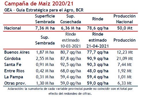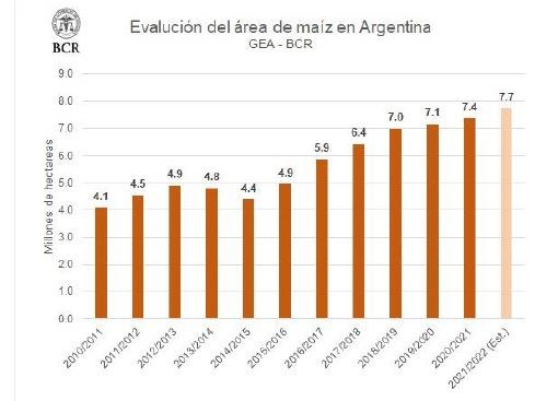 El objetivo es conquistar un nuevo escalón de rindes sí el clima acompaña o, en caso contrario, perder lo menos posible, contando con un cultivo bien nutrido. Sin el escenario de "Niña" como el año pasado, se estima un crecimiento interanual de un 5%, el maíz 2021/22 alcanzaría una siembra de 7,73 M de ha —6,73 de grano comercial—. Con un rinde promedio de 80,4 qq/ha, el horizonte productivo es 54,1 M Tn, es decir un 5% más de volumen que el récord productivo del 2018/19 y 2019/20 (ambas campañas obtuvieron una cosecha de 51,5 Mt).