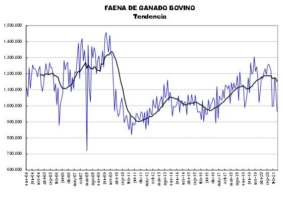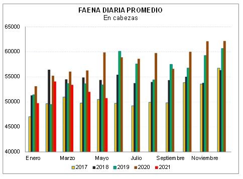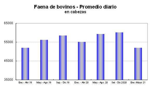 En el mayo de 2021, la faena fue un 17% inferior respecto a igual mes del año pasado, encontrándose entre los registros menores de la historia reciente para ese período. En los últimos doce meses, se han sacrificado 13.8 millones de cabezas, 2% por menos que en igual lapso cerrado en mayo de 2020, pese a la incidencia de los altos guarismos de la segunda mitad del año pasado.