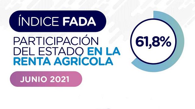 FADA (Fundación Agropecuaria para el Desarrollo de Argentina) publicó la medición trimestral que indica cuánto de lo que produce el campo se lo queda el Estado en impuestos. En junio 2021 se registró que 61,8% de la renta agrícola queda en los distintos niveles de gobierno. “En otras palabras: el productor en el campo vende su cosecha, a eso le resta los costos que tuvo para producirla. Una vez hecha esa cuenta, valor de la producción menos los costos, supongamos que da $100, de esos $100 el Estado se queda con $61,80 entre impuestos nacionales, provinciales y municipales”, explicó David Miazzo, Economista Jefe de FADA.
