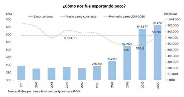El gráfico muestra que el 2020, con un nivel de exportación de 900.000 toneladas, se terminó con un precio de la carne al mostrador en torno a los 582 $/kg, considerando los tres principales cortes preferidos por la población: asado, bola de lomo y nalga. “Sin embargo, cuando embarcábamos 200 mil toneladas, casi nada, a plata de hoy estábamos en 650-700$/kg. Entonces, no es argumento que con suspender la exportación o poner cupos, vamos a encontrar la solución, porque ya se hizo y no funcionó, todo lo contrario, la carne estaba más cara”, aseveró.