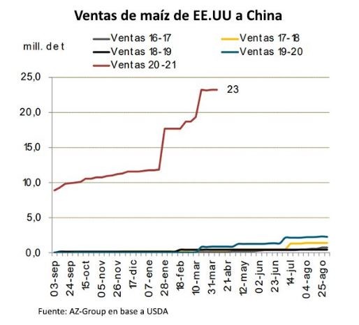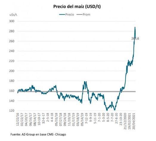 Otra variable que viene pegando en la ganadería y que también explica el aumento de precios, es la escalada del maíz a nivel internacional. “Se disparó, estamos en 265 USD/t, cuando el promedio de los últimos 5 años fue de apenas 160 USD/t. Esto se debe a algunas fallas productivas en EE.UU, perspectivas negativas en Brasil y, sobre todo, a un nuevo jugador que emerge con fuerza como importador”, explicó Ponti, aludiendo a China que, por ejemplo, le compraba a EE.UU, 2- 2,5 millones de t, y en la última campaña se llevó 23 millones de t.