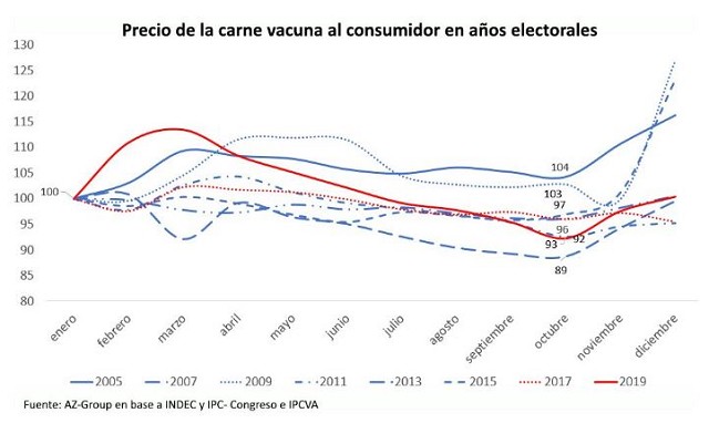 “En el gráfico se ve en líneas azules que, durante los gobiernos peronistas (2005, 2007,2009, 2011, 2013 y 2015) la carne llegó al mes de octubre de elecciones, con precios inferiores en moneda constante, a los de enero de cada año, achatados por distintos mecanismos intervencionistas”, afirmó. Y prosiguió: “las excepciones se dan en 2005, año previo al cierre de exportaciones, y en 2009 cuando ya estábamos en la cola de la liquidación del stock, se empezaba a sentir la falta de oferta y volvía a despegar el precio de la hacienda y de la carne”.
