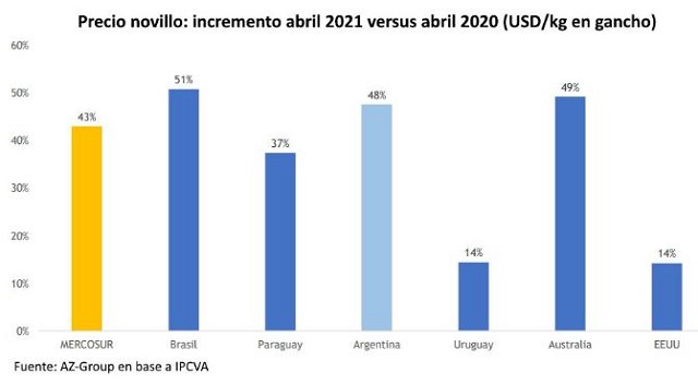 Con este panorama global y frente a una demanda sostenida por carne, el precio de la hacienda subió en todo el mundo. Comparando abril de 2021 con igual mes del año anterior, en el Mercosur aumentó un 43%, con un promedio de 3,58 USD/kg en gancho; en EE.UU, un 14%, llegando a USD/kg 4,26; y en Australia, donde además hay retención de stock tras un ciclo de sequía, aumentó 49%, a USD/kg 5, 24.
